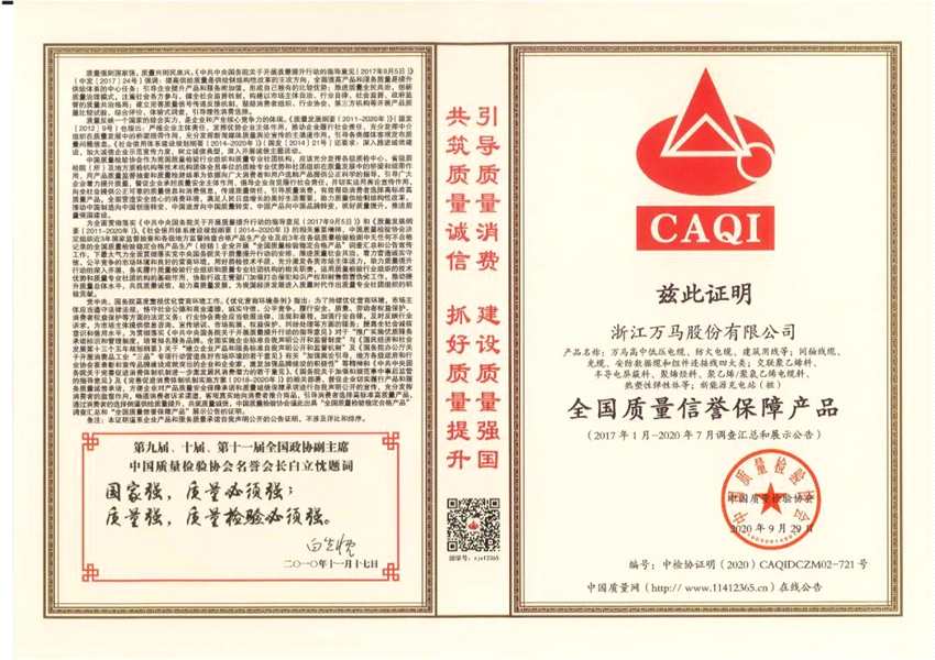 近期,在以“建設(shè)質(zhì)量強(qiáng)國(guó) 決勝全面小康”為主題的2020年全國(guó)“質(zhì)量月”活動(dòng)中,【萬馬股份(002276)、股吧】(002276)榮獲“全國(guó)電線電纜行業(yè)質(zhì)量領(lǐng)先品牌”、“全國(guó)質(zhì)量信譽(yù)保障產(chǎn)品”等多項(xiàng)榮譽(yù)!
