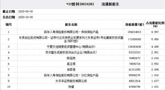 三季報(bào)顯示,截至三季度末,百年人壽保險(xiǎn)股份有限公司-傳統(tǒng)保險(xiǎn)產(chǎn)品持有*ST勝利2.04億股,占流通股比例為6.987%,為*ST勝利第一大流通股股東;東吳創(chuàng)業(yè)投資有限公司-證券行業(yè)支持民企發(fā)展系列之東吳證券1號(hào)私募股權(quán)投資基金(契約型)持有*ST勝利1.71億股,占流通股比例為5.850%,為*ST勝利第二大流通股股東;百年人壽保險(xiǎn)股份有限公司-分紅保險(xiǎn)產(chǎn)品持有*ST勝利5599.63萬股,占流通股比例為1.916%,為*ST勝利第八大流通股股東;太平洋證券股份有限公司持有*ST勝利4901.18萬股,占流通股比例為1.677%,為*ST勝利第九大流通股股東。