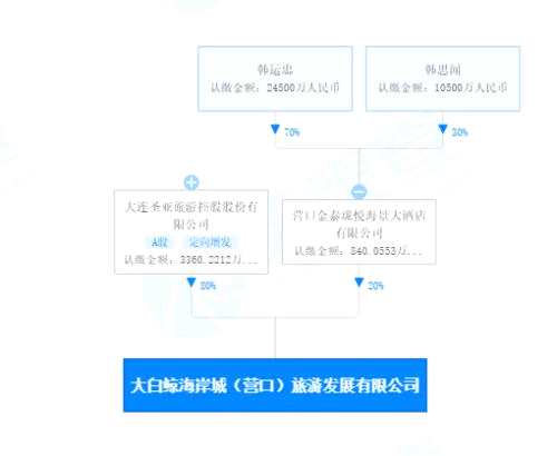 天眼查顯示,截至目前,大白鯨海岸城營(yíng)口公司注冊(cè)地位于遼寧省營(yíng)口市鲅魚(yú)圈區(qū)熊岳鎮(zhèn)站前街,注冊(cè)資本為4200.2765萬(wàn)人民幣,其中大連圣亞持股80%,金泰瓏悅持股20%,而自然人韓運(yùn)忠和韓思聞分別持有金泰瓏悅70%和30%的股權(quán)。
