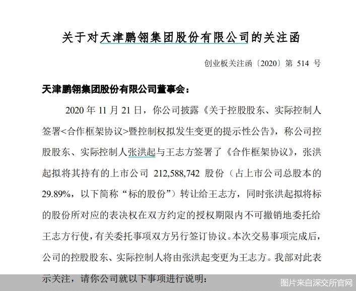 對于此次控制權(quán)轉(zhuǎn)讓事件,深交所要求鵬翎股份說明發(fā)生背景、原因、具體籌劃過程、后續(xù)正式協(xié)議簽署安排以及該事項對公司生產(chǎn)經(jīng)營可能產(chǎn)生的影響,并充分提示相關(guān)風(fēng)險。
