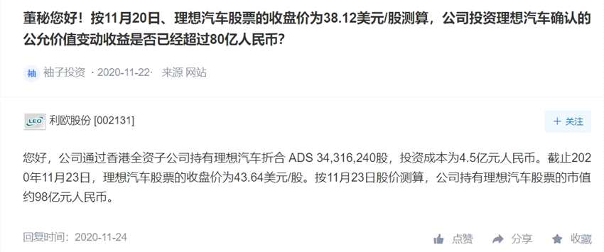11月23日,A股上市公司【利歐股份(002131)、股吧】(002131)在互動平臺上透露,公司通過香港全資子公司持有理想汽車折合ADS(美國存托股份)為3431.624萬股,投資成本為4.5億元。截止11月23日,公司持有理想汽車股票的市值約98億元人民幣。
