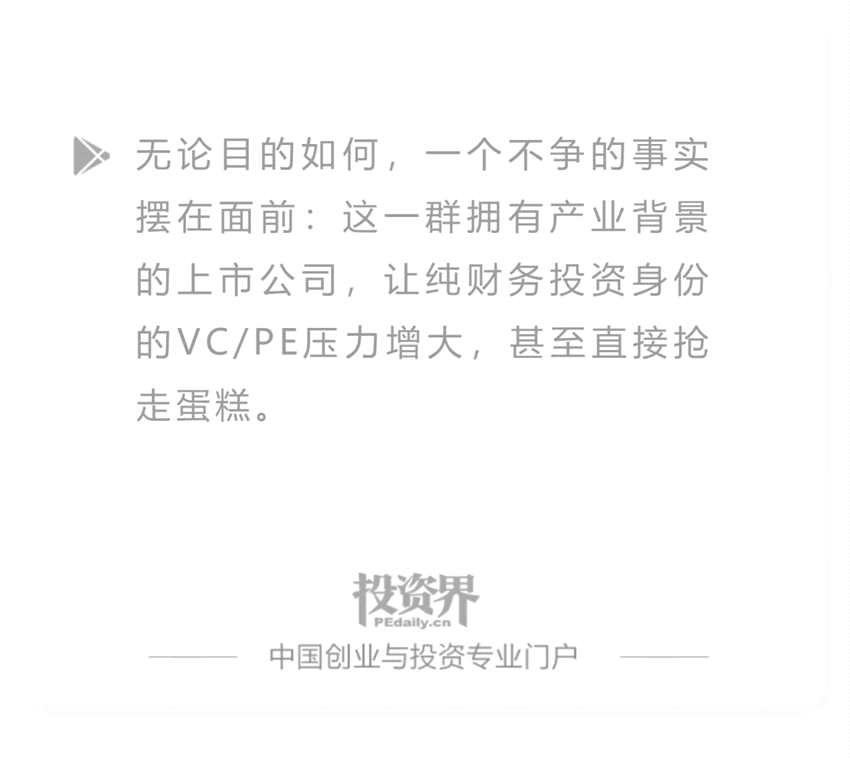上市公司做風(fēng)投盛行,這一群擁有產(chǎn)業(yè)背景的玩家,漸漸讓純財務(wù)投資身份的VC/PE壓力增大,甚至直接搶走蛋糕。