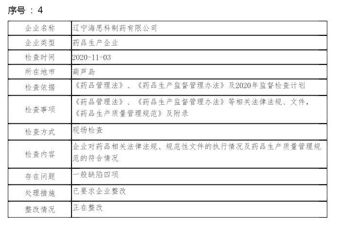 遼寧海思科制藥有限公司在2020年11月3日的現(xiàn)場檢查中,遼寧省藥品監(jiān)督管理局發(fā)現(xiàn)一般缺陷四項(xiàng)。檢查內(nèi)容為企業(yè)對藥品相關(guān)法律法規(guī)、規(guī)范性文件的執(zhí)行情況及藥品生產(chǎn)質(zhì)量管理規(guī)范的符合情況。檢查依據(jù)為《藥品管理法》、《藥品生產(chǎn)監(jiān)督管理辦法》及2020年監(jiān)督檢查計劃。已要求企業(yè)整改,現(xiàn)正在整改。