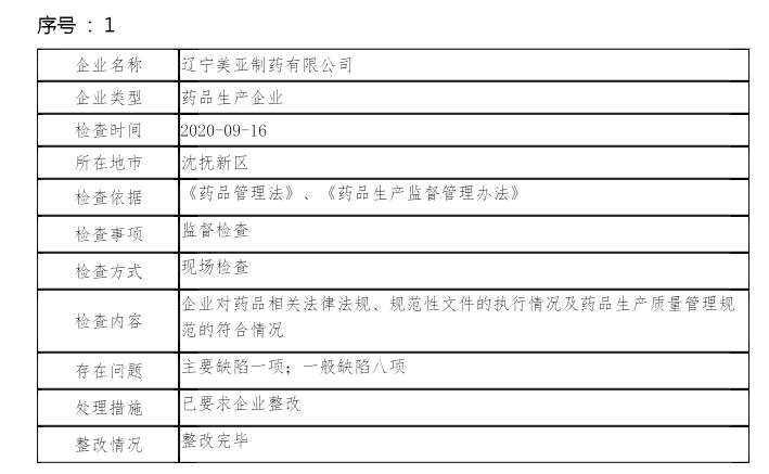 其中,遼寧美亞制藥有限公司在2020年9月16日的現(xiàn)場檢查中,遼寧省藥品監(jiān)督管理局發(fā)現(xiàn)主要缺陷一項(xiàng)、一般缺陷八項(xiàng)。檢查內(nèi)容為企業(yè)對藥品相關(guān)法律法規(guī)、規(guī)范性文件的執(zhí)行情況及藥品生產(chǎn)質(zhì)量管理規(guī)范的符合情況。檢查依據(jù)為《藥品管理法》、《藥品生產(chǎn)監(jiān)督管理辦法》。已要求企業(yè)整改,現(xiàn)已整改完畢。