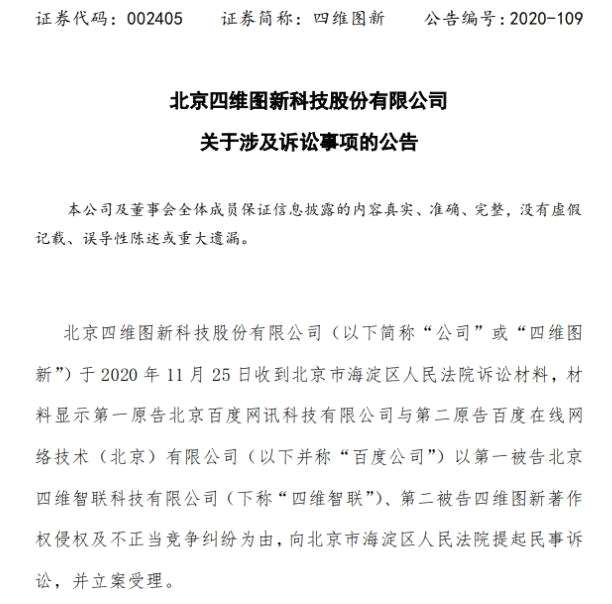 值得一提的是,在百度提起訴訟之前的10月23日,四維圖新也重新向百度公司提起了訴訟。