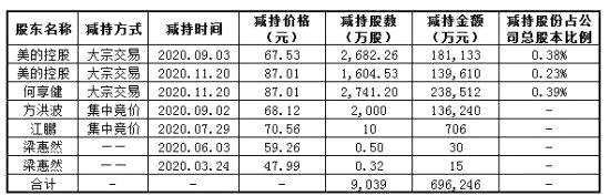 減持后,美的控股及其一致行動(dòng)人何享健仍擁有美的31.12%的股權(quán)且未來12個(gè)月內(nèi)無減持計(jì)劃。此外,今年3月開始,美的監(jiān)事梁惠然、董秘江鵬、董事長方洪波紛紛減持,三人合計(jì)套現(xiàn)達(dá)13.7億元。具體減持情況如下圖所示: