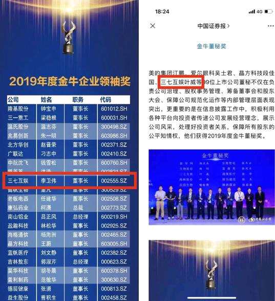 (圖1:三七互娛董事長李逸飛(李衛(wèi)偉)獲金牛企業(yè)領袖獎;圖2:三七互娛董秘葉威獲金牛董秘獎)