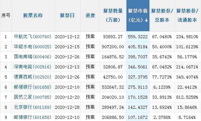 個(gè)股來(lái)看,12月解禁市值超百億元的公司共有9家,分別是中航沈飛(600760)、華能水電(600025)、國(guó)電南瑞(600406)、郵儲(chǔ)銀行(601658)、深南電路(002916)、德賽西威(002920)、長(zhǎng)春高新(000661)、工業(yè)富聯(lián)(601138)、北京銀行(601169)。其中,中航沈飛、華能水電、國(guó)電南瑞分別以559.32億元、405.52億元、395.7億元位居前三。從解禁數(shù)量占流通股本比例來(lái)看,12月解禁個(gè)股中有35只比例超100%,16只超200%,其中成都燃?xì)猓?03053)、好太太(603848)、【中新集團(tuán)(601512)、股吧】(601512)三家公司解禁數(shù)量占流通股本比例超過(guò)了400%,股本擴(kuò)容壓力較大。