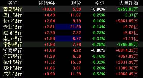青島銀行(002948)封漲停,長(zhǎng)沙銀行(601577)、興業(yè)銀行(601166)、建設(shè)銀行(601939)、南京銀行(601009)跟漲。