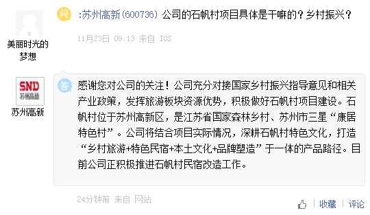 發(fā)布易11月30日 - 蘇州高新(600736)在互動平臺回復投資者提問時表示,公司充分對接國家鄉(xiāng)村振興指導意見和相關(guān)產(chǎn)業(yè)政策,發(fā)揮旅游板塊資源優(yōu)勢,積極做好石帆村項目建設(shè)。石帆村位于蘇州高新區(qū),是江蘇省國家森林鄉(xiāng)村、蘇州市三星“康居特色村”。公司將結(jié)合項目實際情況,深耕石帆村特色文化,打造“鄉(xiāng)村旅游+特色民宿+本土文化+品牌塑造”于一體的產(chǎn)品路徑。目前公司正積極推進石帆村民宿改造工作。