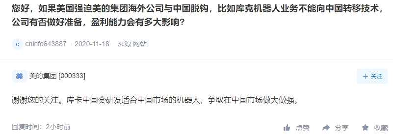 美的集團(000333)在互動平臺上表示,庫卡中國會研發(fā)適合中國市場的機器人,爭取在中國市場做大做強。