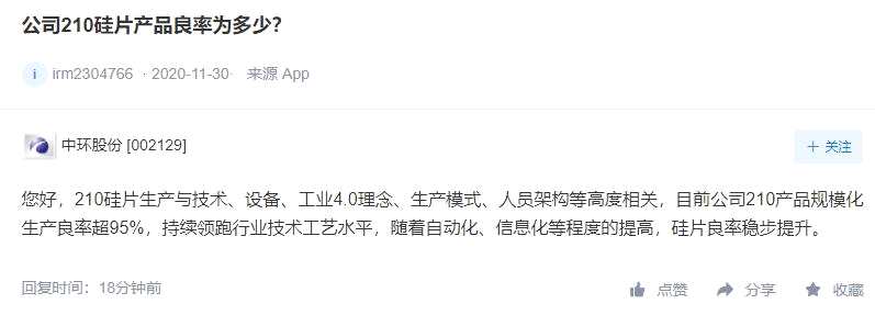 中環(huán)股份:目前公司210產(chǎn)品規(guī)?;a(chǎn)良率超95%