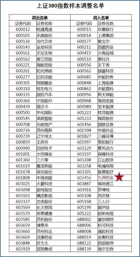 近日,上海證券交易所發(fā)布《關(guān)于調(diào)整上證50、上證180、上證380等指數(shù)樣本的公告》,上海證券交易所與中證指數(shù)有限公司對(duì)多個(gè)指數(shù)樣本股進(jìn)行調(diào)整,本次調(diào)整于12月14日正式生效。本次調(diào)整后,九洲藥業(yè)(603456)將被納入上證380指數(shù)。