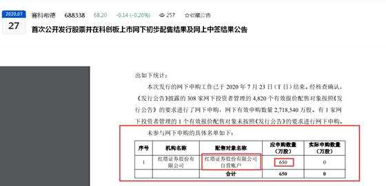 賽科希德披露的《首次公開(kāi)發(fā)行股票并在科創(chuàng)板上市網(wǎng)下初步配售結(jié)果及網(wǎng)上中簽結(jié)果公告》顯示,本次發(fā)行的網(wǎng)下申購(gòu)工作已于 2020 年 7 月 23 日(T 日)結(jié)束。經(jīng)核查確認(rèn),《發(fā)行公告》披露的 308 家網(wǎng)下投資者管理的 4,820 個(gè)有效報(bào)價(jià)配售對(duì)象按照《發(fā)行公告》的要求進(jìn)行了網(wǎng)下申購(gòu),網(wǎng)下有效申購(gòu)數(shù)量 2,718,540 萬(wàn)股。有 1 家網(wǎng)下投資者管理的 1 個(gè)有效報(bào)價(jià)配售對(duì)象即紅塔證券股份有限公司自營(yíng)賬戶未按照《發(fā)行公告》的要求進(jìn)行網(wǎng)下申購(gòu)。