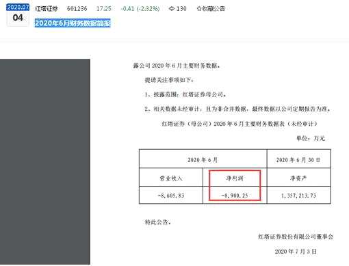 今年7月3日,紅塔證券披露《2020年6月財(cái)務(wù)數(shù)據(jù)簡(jiǎn)報(bào)》顯示,2020 年 6 月的營(yíng)收為--8,605.83,凈利潤(rùn)為-8,900.25萬(wàn)元。