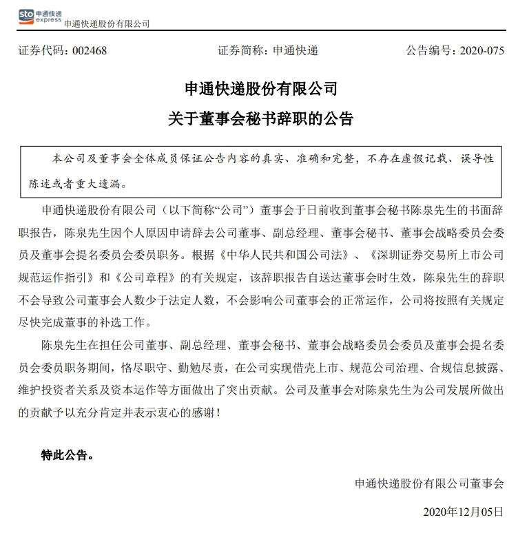 12月5日消息,《電商報(bào)》獲悉,申通快遞(002468)股份有限公司發(fā)布公告稱,日前,公司董事會(huì)秘書陳泉因個(gè)人原因申請(qǐng)辭去公司董事、副總經(jīng)理、董事會(huì)秘書、董事會(huì)戰(zhàn)略委員會(huì)委員及董事會(huì)提名委員會(huì)委員職務(wù)。