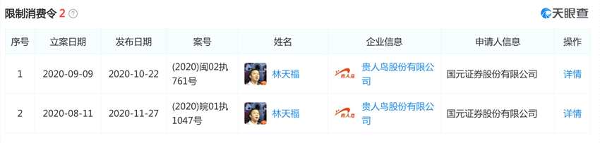 林天福今年收到兩次限制消費(fèi)令。截圖自天眼查App