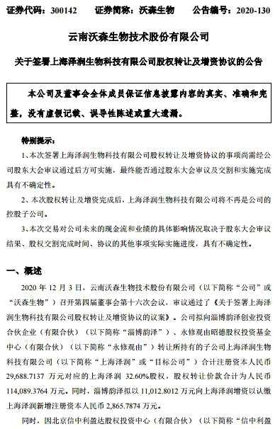 12月4日晚,沃森生物公告以11.4億元轉(zhuǎn)讓上海澤潤(rùn)32.60%股權(quán)。交易完成后,上海澤潤(rùn)將不再是其控股子公司。