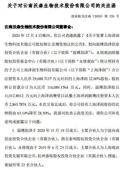 12月6日晚間,深交所向沃森生物下發(fā)關(guān)注函,要求說(shuō)明本次轉(zhuǎn)讓上海澤潤(rùn)控制權(quán)的合理性,以及轉(zhuǎn)讓股權(quán)比例的確定依據(jù),本次交易是否存在利益輸送等損害上市公司和中小投資者利益的行為。