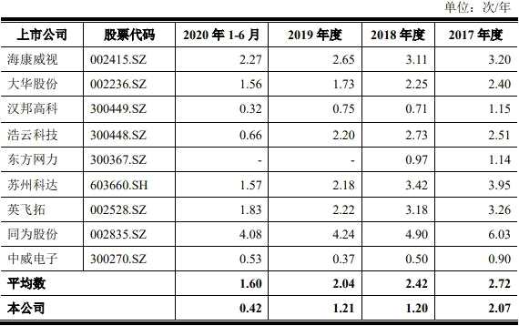 2016年度、2017年度、2018年度、2019年度及2020年1-6月,公司存貨周轉(zhuǎn)率為2.89、3.34、3.52、8.83、2.62,與同行業(yè)上市公司平均值分別為3.42、3.61、3.67、3.56、1.98。