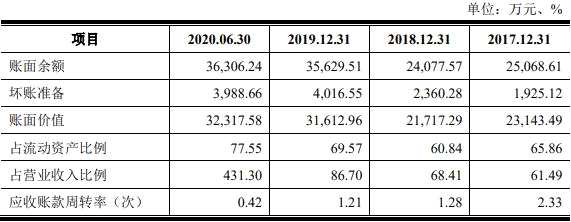 2016年末至2010年6月末,聲迅股份應(yīng)收賬款賬面余額分別為7306.66萬(wàn)元、2.51億元、2.41億元、3.56億元、3.63億元,應(yīng)收賬款賬面價(jià)值分別為6106.13萬(wàn)元、2.31億元、2.17億元、3.16億元和3.23億元,占流動(dòng)資產(chǎn)的比例分別為30.77%、65.86%、60.84%、69.57%和77.55%,占營(yíng)業(yè)收入比例分別為31.69%、61.49%、68.41%、86.70%和431.30%。