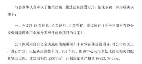 12月7日晚,江淮發(fā)布公告表示,七屆二十三次董事會(huì)會(huì)議審議通過(guò)《關(guān)于利用自有資金投資新能源乘用車(chē)車(chē)身零部件建設(shè)項(xiàng)目的議案》。