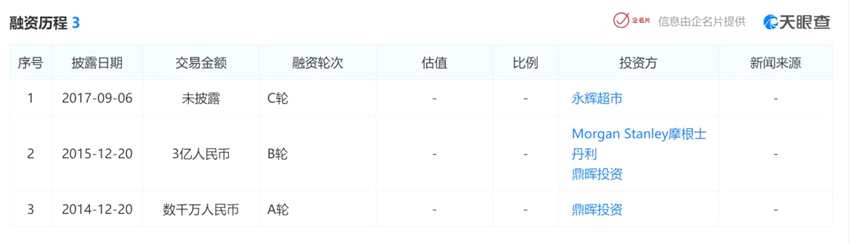 公司目前已經(jīng)融資至C論,包括鼎暉投資、摩根士丹利、永輝超市均為投資方。