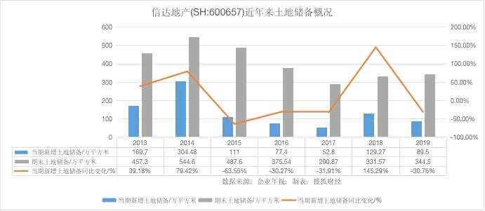 縱使如此,2019年,信達地產(chǎn)新增土地儲備89.5萬平米,也較2018年減少30.76%。期末總土儲344.5萬平米,較2018年末僅微增3.8%。