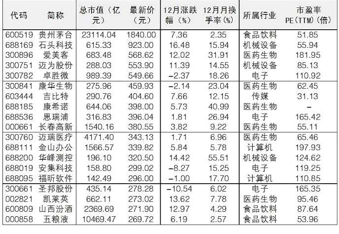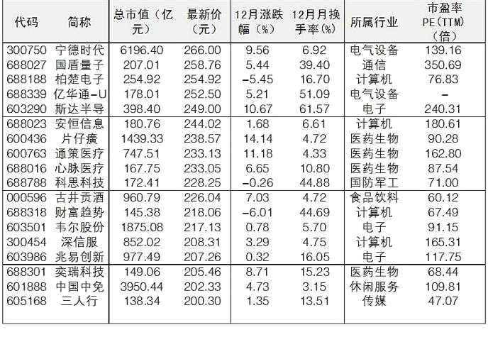 本周貴州茅臺(tái)(行情600519,診股)股價(jià)創(chuàng)出歷史新高,而昨日兩市第二高價(jià)股石頭科技(行情688169,診股)的股價(jià)亦創(chuàng)出歷史新高。根據(jù)Wind統(tǒng)計(jì),截至昨日,兩市已有37股股價(jià)超200元,較今年11月初的32只增加了5只。