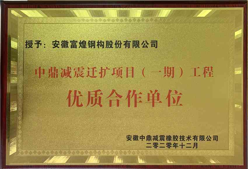 近日,由安徽【富煌鋼構(gòu)(002743)、股吧】(002743)股份有限公司承建的寧國中鼎減震遷擴(kuò)項(xiàng)目(一期)1#、2#、4#、食堂、外協(xié)庫鋼結(jié)構(gòu)工程,項(xiàng)目部安全、高效、優(yōu)質(zhì)地完成各項(xiàng)施工任務(wù),贏得安徽中鼎減震橡膠技術(shù)有限公司的高度認(rèn)可,并授予富煌鋼構(gòu)“中鼎減震遷擴(kuò)項(xiàng)目(一期)工程優(yōu)質(zhì)合作單位”稱號(hào)。