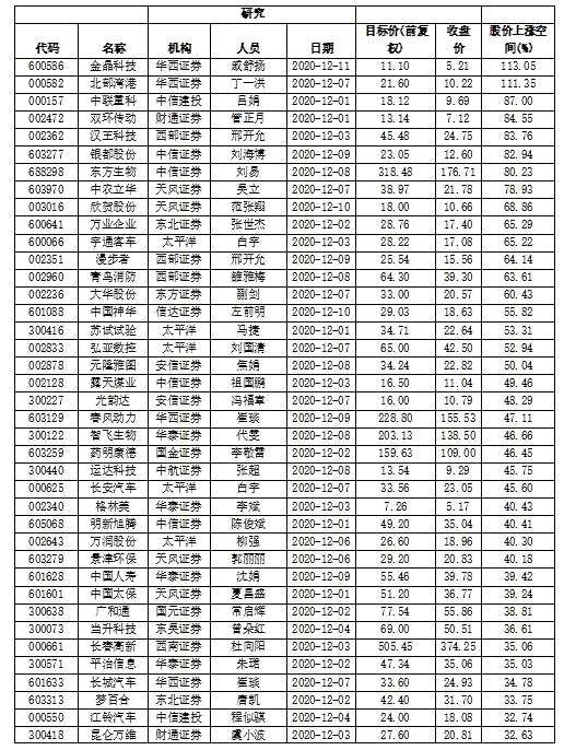 12月份以來,滬深兩市股指沖高回落。市況波動,加之市場熱點切換輪動較快,機構(gòu)研究員多“靜觀其變”。據(jù)數(shù)據(jù)顯示,截止 12月11日,12月份以來券商研究員僅對140家公司的投資評級及目標(biāo)價進(jìn)行了“再評估”。 其中,給予了78 股“買入”評級。給出具體目標(biāo)價的公司中,61家公司周五收盤價距券商研究員給出的目標(biāo)價還有逾20%的空間。