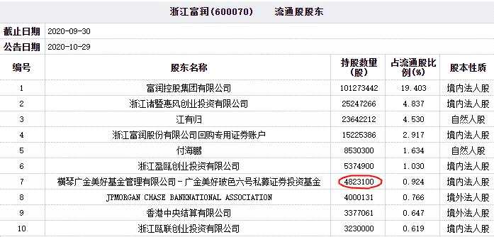 截至2020年三季度末,橫琴廣金美好基金管理有限公司-廣金美好玻色六號(hào)私募證券投資基金持有浙江富潤(rùn)482.31萬股,占流通股比例0.924%,為第七大流通股股東。