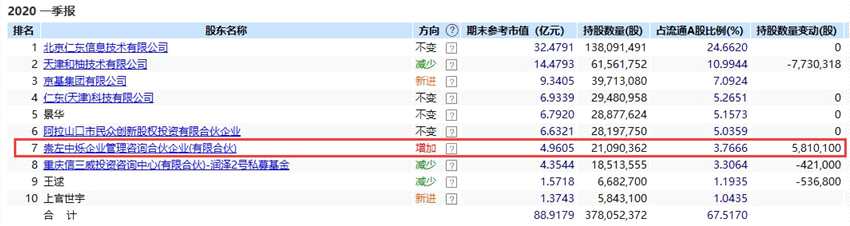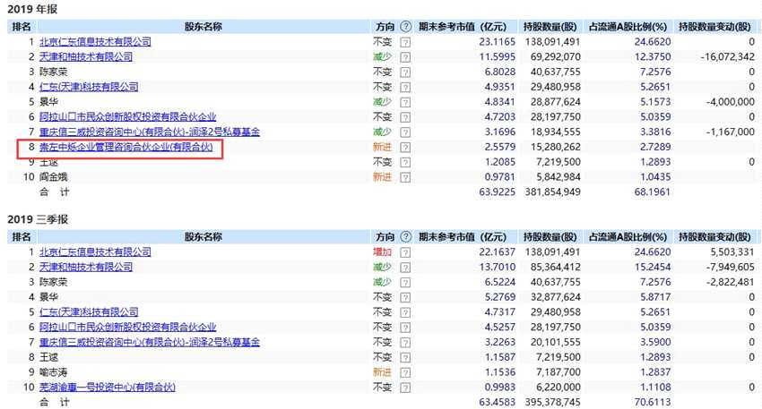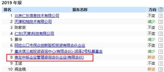 翻閱過往年報顯示,崇左中爍是2019年第四季度首次進入仁東控股的前十大流通股榜單。