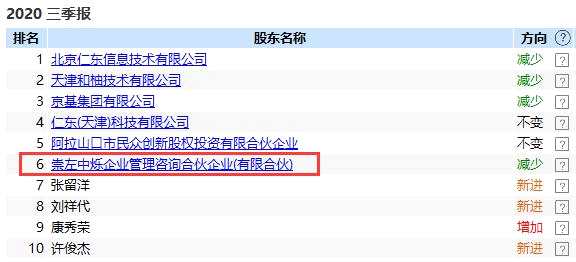 根據(jù)2020年三季報顯示,崇左中爍是仁東控股的第六大流通股東。