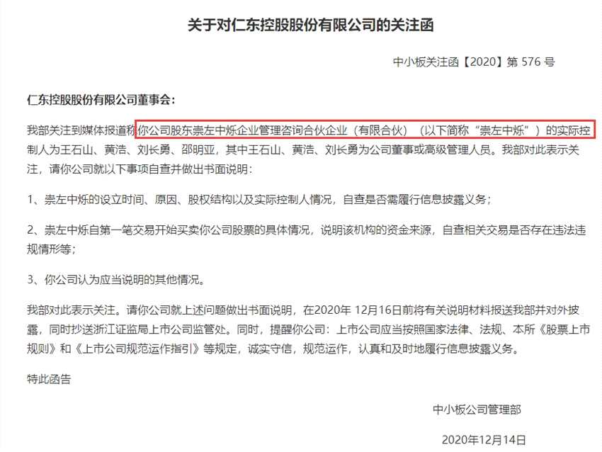 14日盤后, 仁東控股 公告,公司收中小板關(guān)注,深交所要求公司說明崇左中爍的設(shè)立時間、原因、股權(quán)結(jié)構(gòu)以及實際控制人情況,自查是否需履行信息披露義務(wù)。崇左中爍自第一筆交易開始買賣公司股票的具體情況,說明該機構(gòu)的資金來源,自查相關(guān)交易是否存在違法違規(guī)情形等。
