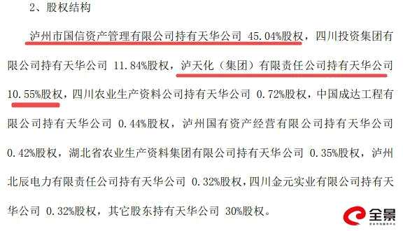 其中,瀘天化(集團(tuán))正是上市公司瀘天化的控股股東,其實(shí)際控制人為瀘州市國資委;而天華公司大股東瀘州市國信資產(chǎn)管理有限公司的實(shí)際控制人也為瀘州市國資委。
