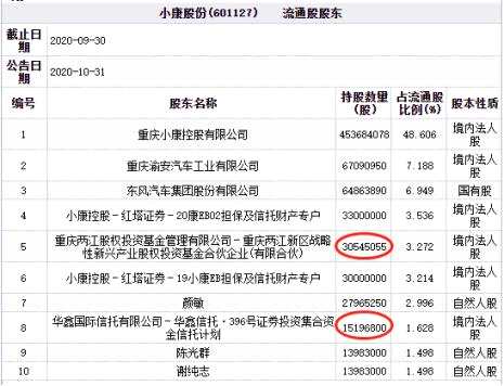 截至三季度末,重慶兩江股權(quán)投資基金管理有限公司-重慶兩江新區(qū)戰(zhàn)略性新興產(chǎn)業(yè)股權(quán)投資基金合伙企業(yè)(有限合伙)(簡稱:兩江戰(zhàn)略基金)持有小康股份3054.51萬股,占流通股比例為3.272%,是其第五大流通股股東;華鑫國際信托有限公司-華鑫信托·396號證券投資集合資金信托計劃持有小康股份1519.68萬股,占流通股比例為1.628%,是其第八大流通股股東。