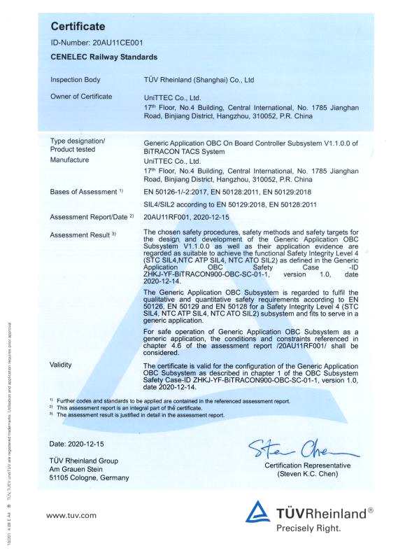 2020年12月15日,浙江【眾合科技(000925)、股吧】(000925)股份有限公司的BiTRACON型TACS車載OBC子系統(tǒng)通過了國際權(quán)威第三方獨立安全評估機構(gòu)德國T V萊茵的安全評估,獲得國際最高安全完整性等級SIL4級認證證書。