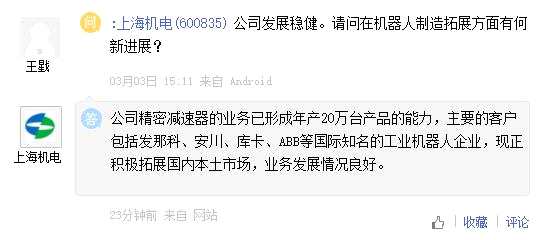上海機電(600835)在互動平臺回復(fù)投資者提問時表示,公司精密減速器的業(yè)務(wù)已形成年產(chǎn)20萬臺產(chǎn)品的能力,主要的客戶包括發(fā)那科、安川、庫卡、ABB等國際知名的工業(yè)機器人企業(yè),現(xiàn)正積極拓展國內(nèi)本土市場,業(yè)務(wù)發(fā)展情況良好。