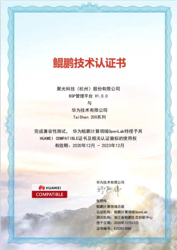 近日,【聚光科技(300203)、股吧】(300203)(杭州)股份有限公司(以下簡稱:聚光科技)BSP管理平臺等多款產(chǎn)品與華為鯤鵬服務(wù)順利完成兼容性測試認(rèn)證,這標(biāo)志著聚光科技自主創(chuàng)新的技術(shù)能力得到了認(rèn)可,在國產(chǎn)化設(shè)備的技術(shù)匹配能力邁出了一大步!