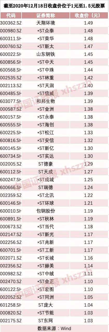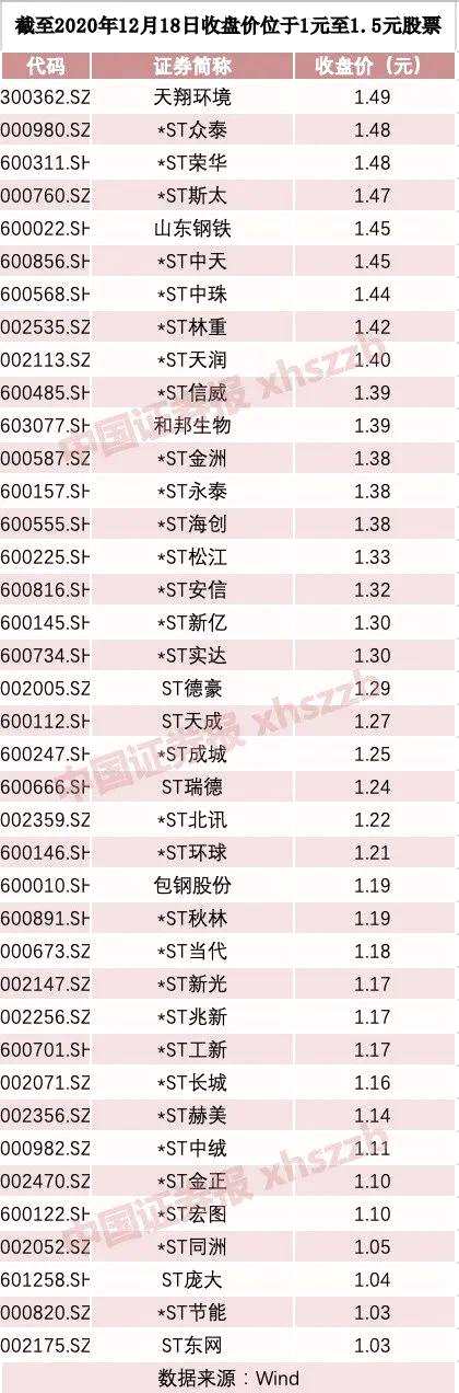 數(shù)據(jù)顯示,截至12月18日收盤,股價位于1元至1.5元之間的股票,共有39只。其中,ST股所占比例高達(dá)89.74%。