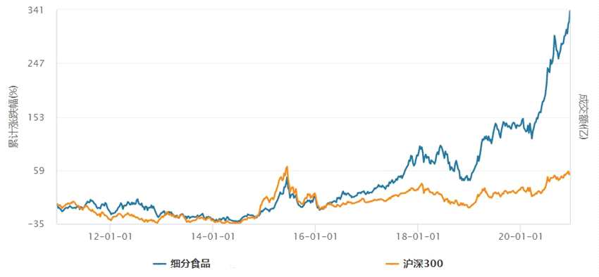 從細(xì)分食品指數(shù)的整體表現(xiàn)來看,數(shù)據(jù)顯示,截至今年12月17日,該指數(shù)自基日(2004年12月31日)以來,累計(jì)漲幅高達(dá)3343.95%,折合成年化收益超過了25%。大幅跑贏同期上證綜指、滬深300、深成指等主流寬基指數(shù),可謂是長期走牛。最近三年,該指數(shù)的年化收益率水平,更是超過35%,創(chuàng)造了明顯的超額收益。