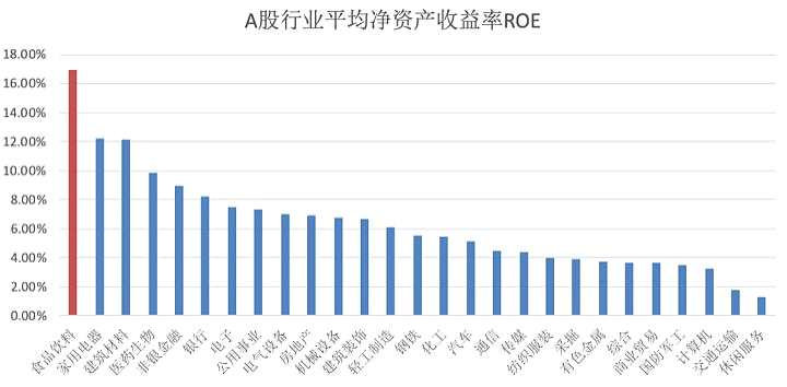 除了時(shí)代浪潮的助力,食品飲料股價(jià)長牛的背后還有寬闊的動態(tài)護(hù)城河造就的無可媲美的ROE。查理芒格曾說,“長期而言,一只股票的長期收益率約等于其ROE?!睅资踔辽习倌甑钠放拼蛟鞛槭称凤嬃瞎驹炀土藷o形的護(hù)城河,龍頭公司的成本和規(guī)模優(yōu)勢讓后來者難以進(jìn)入市場。在護(hù)城河的加持下,A股食品飲料行業(yè)的ROE達(dá)到了16.94%,遠(yuǎn)高于其他行業(yè),也因此具有了巨大的投資價(jià)值。