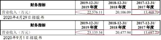 2020年4月29日招股書顯示,2017年至2019年營業(yè)收入分別為1.35億元、2.01億元、2.26億元;2020年9月1日招股書顯示,2017年至2019年營業(yè)收入分別為1.37億元、2.05億元、2.31億元。