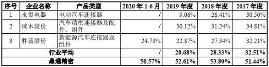 2017年至2020年1-6月,鼎通科技汽車連接器組件毛利率分別為51.44%、53.80%、52.61%、50.57%;2017年-2019年,行業(yè)均值分別為32.51%、28.33%、20.68%,其中,永貴電器2017年-2019年電動汽車連接器產(chǎn)品毛利率分別為30.50%、26.41%、9.06%,【徠木股份(603633)、股吧】(603633)2017年-2019年汽車精密連接器及配件、組件產(chǎn)品毛利率分別為34.81%、31.24%、30.12%,勝藍(lán)股份(300843)2017年至2020年1-6月新能源汽車連接器及組件產(chǎn)品毛利率分別為32.21%、27.34%、22.87%、24.73%。