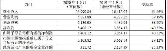 2020年1-9月,鼎通科技實現(xiàn)營業(yè)收入2.70億元,同比增加64.46%;歸屬于母公司股東的凈利潤5408.12萬元,同比增加40.32%;扣除非經(jīng)常性損益后歸屬于母公司所有者的凈利潤5103.82萬元,同比增加39.12%;經(jīng)營活動產(chǎn)生的現(xiàn)金流量凈額311.72萬元,同比下降85.33%。
