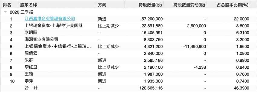 截至三季度末,*ST海源的第一大股東為江西嘉維,持股比例為22%,而第二大股東為吳國繼持股數(shù)量2289萬股,占總股本比例8.8%。