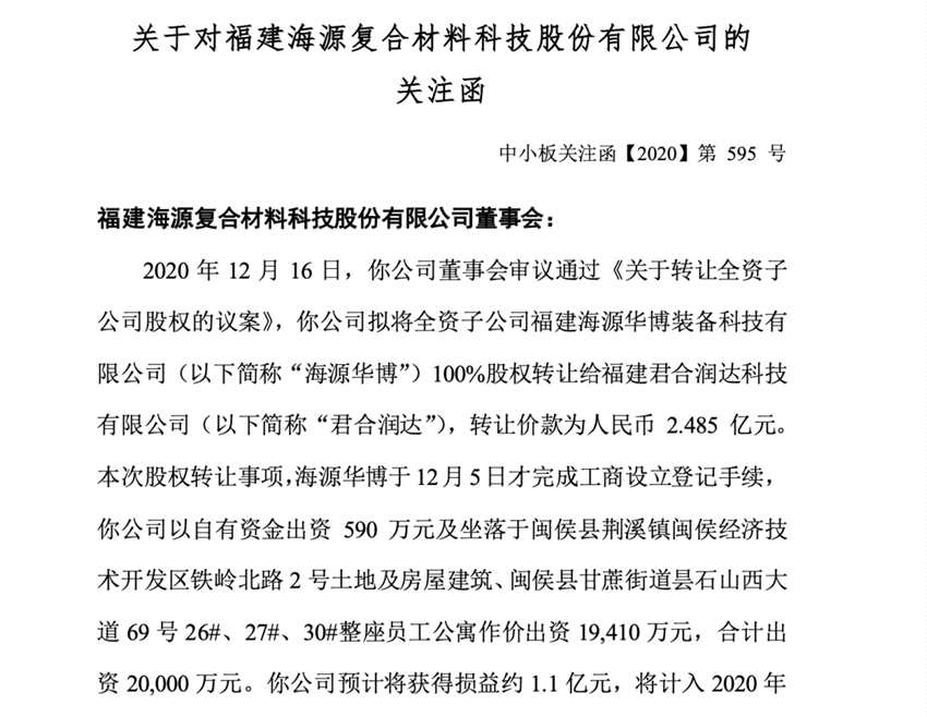 此外,深交所還對(duì)*ST海源轉(zhuǎn)讓全資子公司股權(quán)一事進(jìn)行問詢。根據(jù)*ST海源公司董事會(huì)審議通過《關(guān)于轉(zhuǎn)讓全資子公司股權(quán)的議案》,*ST海源擬將全資子公司福建海源華博裝備科技有限公司(以下簡稱“海源華博”)100%股權(quán)轉(zhuǎn)讓給福建君合潤達(dá)科技有限公司(以下簡稱“君合潤達(dá)”),轉(zhuǎn)讓價(jià)款為人民幣 2.485 億元。本次股權(quán)轉(zhuǎn)讓事項(xiàng),海源華博于12月5日才完成工商設(shè)立登記手續(xù),你公司以自有資金出資590 萬元及坐落于閩侯縣荊溪鎮(zhèn)閩侯經(jīng)濟(jì)技術(shù)開發(fā)區(qū)鐵嶺北路2號(hào)土地及房屋建筑、閩侯縣甘蔗街道曇石山西大道69號(hào)26#、27#、30#整座員工公寓作價(jià)出資19410萬元,合計(jì)出資2億元。*ST海源預(yù)計(jì)將獲得損益約1.1億元,將計(jì)入 2020 年損益。