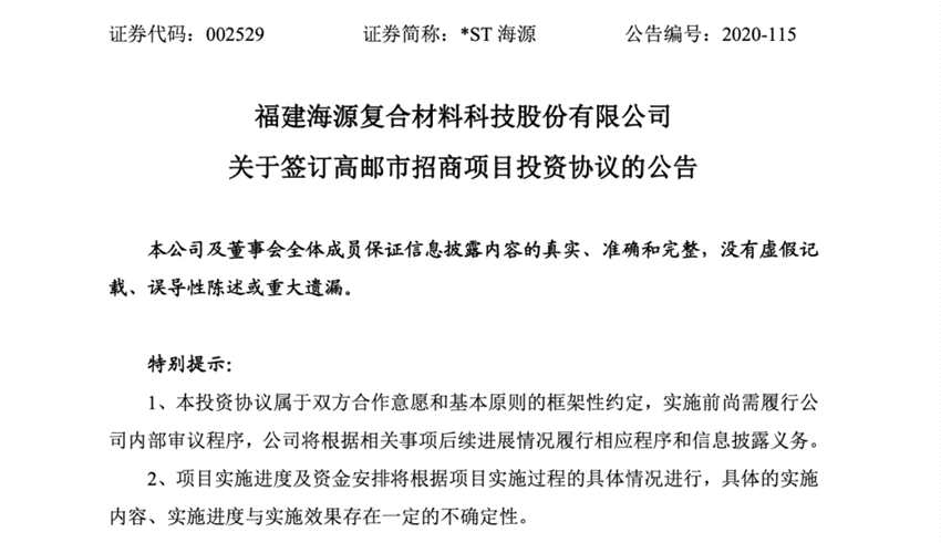 12月21日,深交所向*ST海源下發(fā)關(guān)注函,要求公司結(jié)合在光伏電池行業(yè)的技術(shù)儲(chǔ)備、人才儲(chǔ)備情況,補(bǔ)充說明公司在高郵投資建設(shè)10GW高效光伏電池和10GW高效組件生產(chǎn)項(xiàng)目的可行性,項(xiàng)目投資金額105億元的測算依據(jù),上述對(duì)外投資是否構(gòu)成重大資產(chǎn)重組。