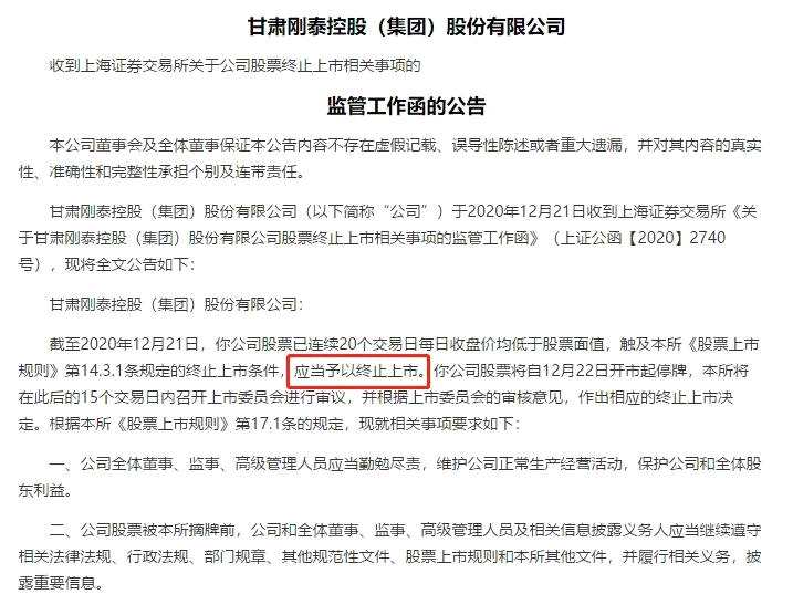 *ST剛泰21日晚間也公告,收到上交所關(guān)于公司股票退市的監(jiān)管工作函,上交所表示,公司股票觸及終止上市(退市)條件,應(yīng)當(dāng)予以終止上市(退市)。*ST剛泰股票將于12月22日開始起停牌,上交所將在此后15個交易日開會,對公司股票做出相應(yīng)的退市決定。